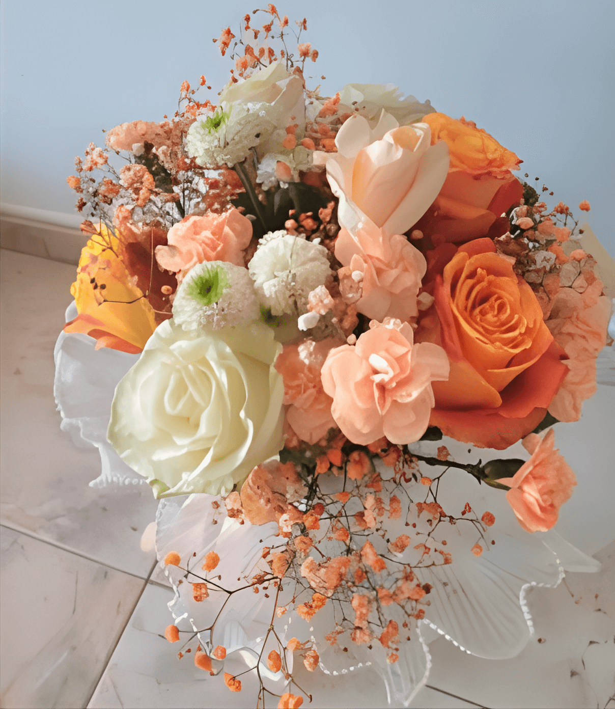 Dieser Strauß in Teerosen-Tönen, mit Nelken und gelben Lilien, wird von orangefarbener Schleierkraut-Paniculata zusammengehalten – alles in den Farben der Herbstsonne bei Sonnenuntergang.