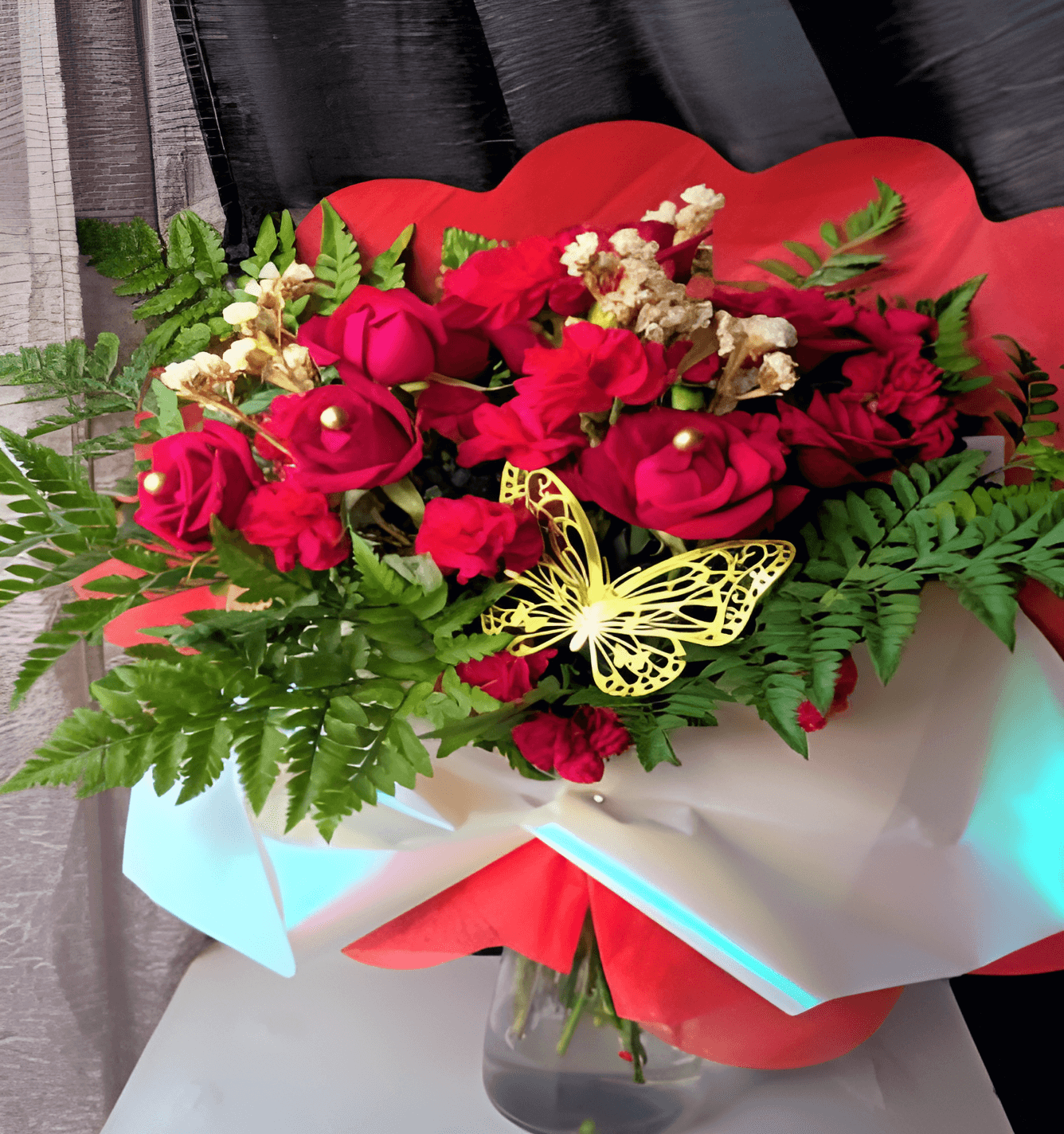 Kleine weiße Trockenblumen setzen einen subtilen Kontrast in der Komposition und brechen die Dominanz des Rots auf. Das Grün der Farne verleiht Natürlichkeit und bildet einen schönen Kontrast zu den roten Blüten, was deren Tiefe hervorhebt. Ein goldener, durchbrochener Schmetterling dient als eleganter Schmuck und verleiht dem Strauß Leichtigkeit. Eingehüllt ist dieser Strauß in zart glänzendes rot-weißes Papier, was für zusätzliche Raffinesse und Eleganz sorgt. Die ideale Wahl für besondere Anlässe, wie romantische Gesten oder Feierlichkeiten, bei denen Liebe und Leidenschaft im Mittelpunkt stehen.