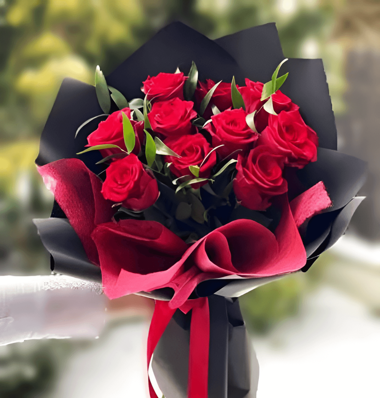 Das tiefe Rot der Rosen symbolisiert Liebe und Leidenschaft, während die auffällige schwarz-rote Verpackung der Komposition einen luxuriösen Charakter verleiht. Die zarten grünen Blätter unterstreichen subtil die Schönheit der Blumen und schaffen eine perfekte Harmonie. Der gesamte Strauß ist mit einem roten Band gebunden und ist die perfekte Art, tiefste Gefühle auszudrücken.